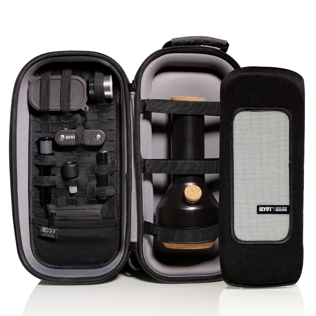The new and improved RYOT Axe Pack GOO.O is the goo-to hard case to confidently pack and protect your large glass, gear, and other goodies. Outfitted with lockable zipper pulls, thick wall padding, a silicone mat divider, X-strap technology, and SmellSafe Carbon Series capabilities, the Axe Pack traps unwanted odors for discrete storage and transport.